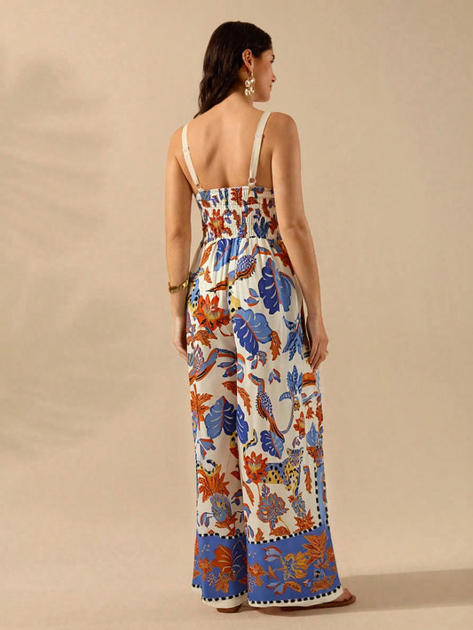 CAJUNI Macacão Preto Longo Estampado com Estampa Boêmia de Leopardo, Abacaxi, Flora e Fauna Tropical, Sem Manga, Casual de Praia de Férias de Verão