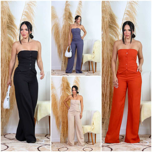 conjunto feminino casual de calça pantalona é blusa tomara que caia