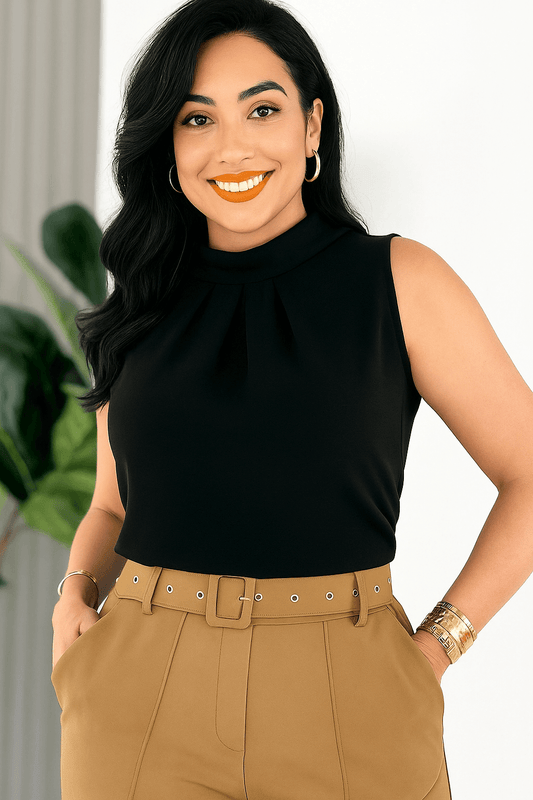 Blusa Social Feminina Elegante Sem Manga – Gola Alta e Detalhe Plissado